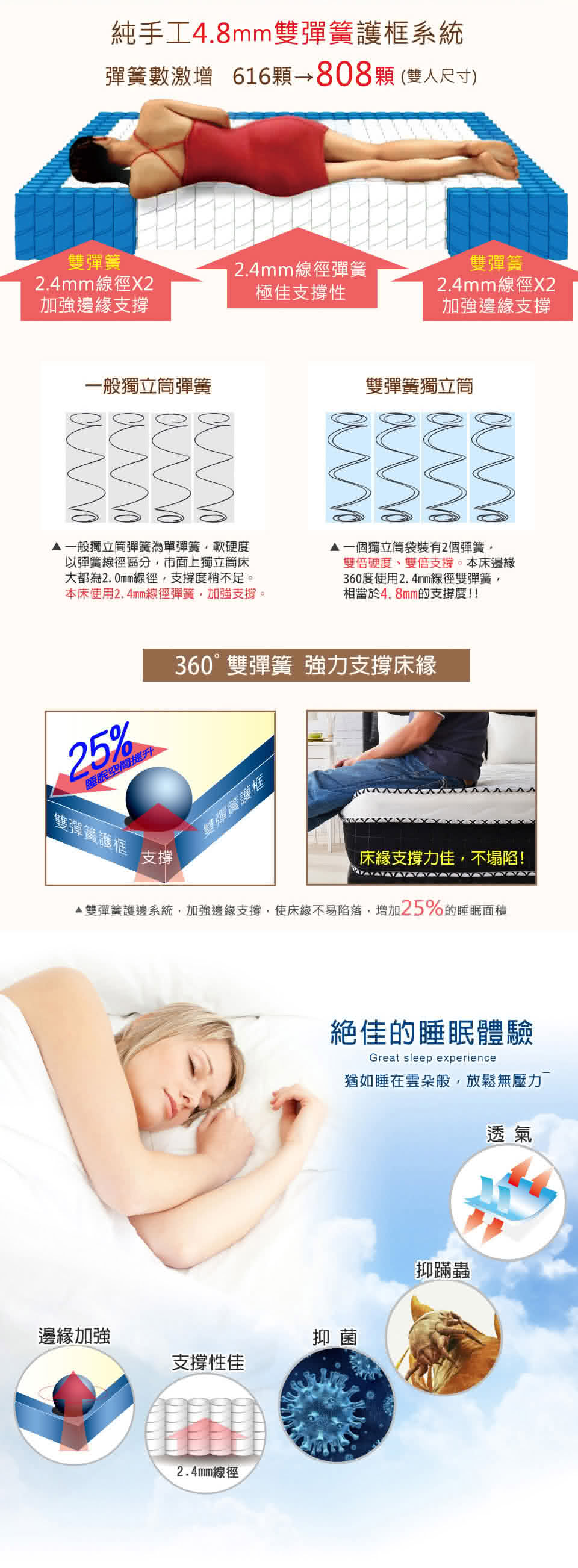 (3)台灣製造,全新彈簧,線徑2.4mm給予彈簧耐用絕佳性,外圍更使用相當於4.8mm線徑雙彈簧加強邊框支撐性。