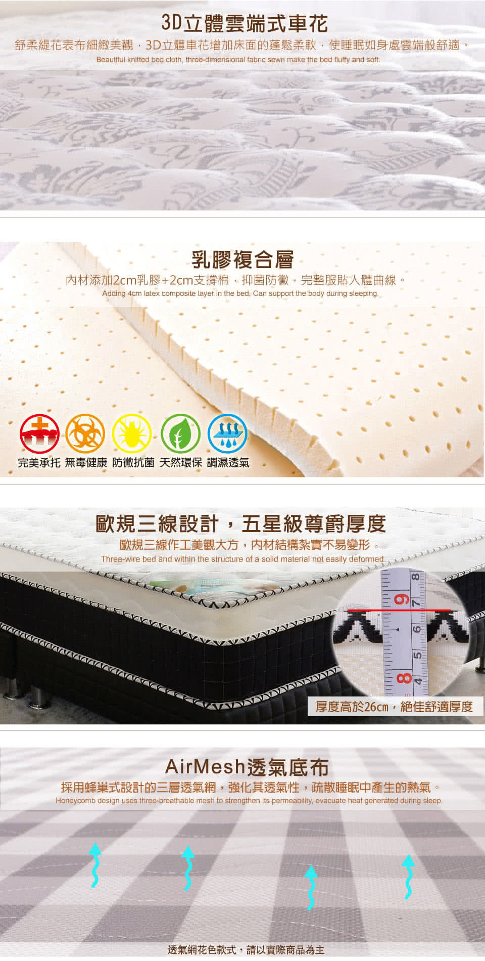 (5)全床加上2cm乳膠+2cm支撐層,完整服貼人體曲線。再採用歐美三線高規床作工,擁有最佳的服貼性,運用天然乳膠層的不聚熱特性,調節濕熱氣候與人體熱氣排放所帶來的悶熱感,讓睡眠品質大大加分。